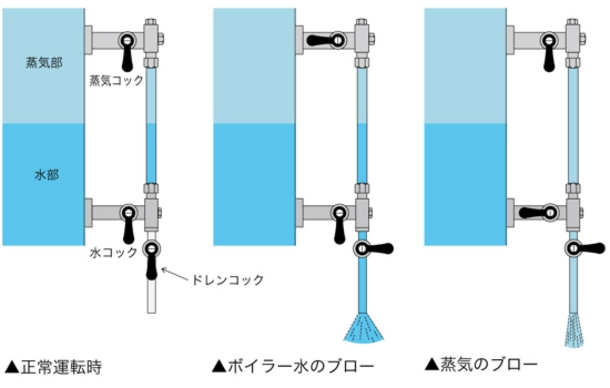 水面計は運転中は一日一回以上、機能の点検をすることが義務づけれています。ボイラー内に圧力がないときは、ボイラー水の吹き出しができませんので、水面計の機能試験は行なえません。