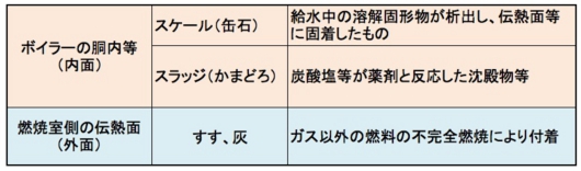 例えば、ボイラーを使用していると、内面にはスケール、スラッジが生成し、腐食が生じます。外面には燃焼生成物のすすが付着して、腐食、運転上の障害、伝熱効率の低下等の影響を及ぼします。