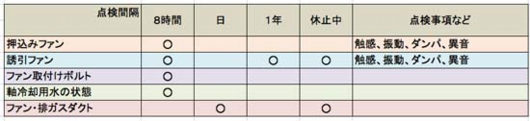 ・ファン装置は下記の表の点検事項を行ない、異常がないかどうかを点検します。