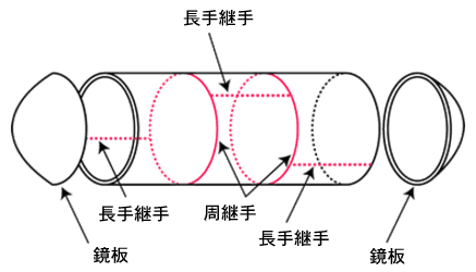 ボイラーの主要部分の胴又はドラムは、円筒形になっています。円筒形なっているには、理由があります。同じ素材で、同じ厚さのものでは、他の形よりも大きな強度が発揮できるからです。胴・ドラムは鋼板を円筒状に巻いたものに、両端を鏡板というものでふさいだもので、接続部分は継手といいます。継手は軸(長手)方向と周方向の2種類があり、溶接で作られます。