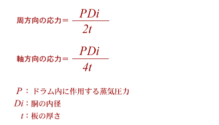 周方向の応力、軸方向の応力を求める計算式は下のようになります。