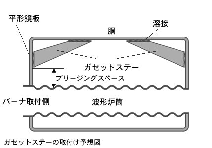 平板(ガセット)により平鏡板を胴で支えるものです。ガセットステーを鏡板に取り付けるほうは、強度の高い突き合わせ両側溶接、胴に取り付けるほうは突き合わせ両側溶接、または両側すみ肉溶接にしなければなりません。煙管ボイラー、炉筒煙管ボイラーに使用されます。