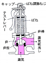 最近のボイラーのほとんどがこのタイプです。ばねの力により、弁棒が弁を弁座に押さえる仕組みになっています。吹出し圧力は、ばねに調整ボルトがあり、それを締めたり緩めたりして、ばねが弁座を押し付ける力を変えることによって調整します。