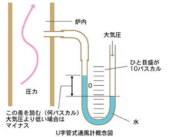 通風計は通風力(ドラフト)を測定します。計測するところ(例えば燃焼室の炉壁に穴をあけ、ここに小さい管を通す)のガス、空気の流れの圧力を、大気の圧力と比較して、その差を水柱で確認します。通風計の種類にはU字管、傾斜式があります。