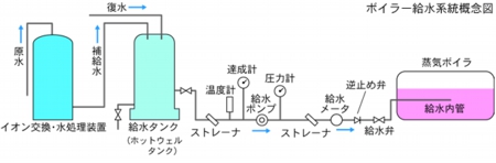 給水系統とは、給水ポンプ、給水タンク、給水流量計、給水弁、逆止め弁、ボイラー内給水内管、そしてこれらをつなぐ配管を総称していいます。