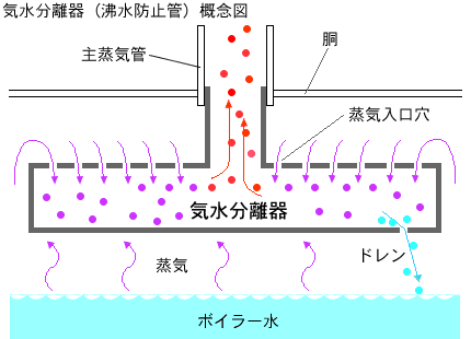 水滴の混じらない蒸気を取出すためのものです。蒸気取出し口は水面のところより沸騰が盛んなので、湿り度の多い蒸気が取出されやすくなるため、これを防ぐことが目的です。これはドラムや胴の中の蒸気出口のすぐ下に取り付けられており、水分の少ない飽和蒸気を取出します。スクラバ式、サイクロン式などの種類があります。