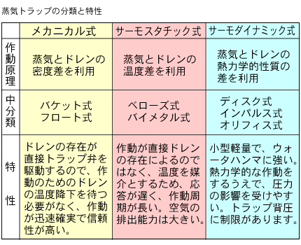 蒸気使用設備内部、配管内部にたまったドレンを、蒸気圧力により自動的に排出する装置です。大きく分けて3つの種類、メカニカル式、サーモスタチック式、サーモダイナミック式があり、さらに中分類にわかれます。