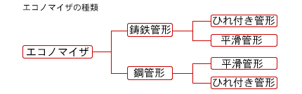 ボイラーの熱損失の中で、一番大きいのは排ガスに含まれている熱量です。この熱を利用して給水の予熱に利用する装置のことです。ボイラー効率の向上と燃料の節約になります。エコノマイザを煙道に設けると、通風が多少悪くなりますので、人工通風で通風力の低下を防止します。エコノマイザにはさまざまな種類があります。