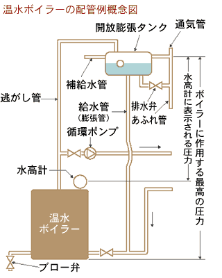 温水ボイラーの水はかなりの高温に加熱されるため、水の体積は膨張し、ボイラー本体が破裂するおそれがあります。これを防ぐためには、ボイラー水の膨張分を逃がすための安全装置、逃がし管、逃がし弁を設けなければなりません。逃がし管は途中に弁やコックのない大気解放管と呼ばれるものであり、高いところに設けた膨張タンクに直結しています。内部の水が凍結するおそれのある場合は、保温などする必要があります。膨張タンクの種類は開放形、密閉形があり、験水管、オーバーフロー管、補給水配管、配水管などが設けられています。密閉形には逃がし弁が取り付けられます。