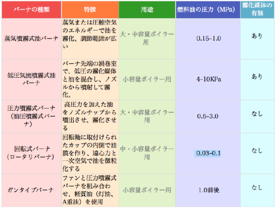 燃料を霧化して噴霧し、空気と接触しやすくして、燃焼反応を速くする働きがあります。油バーナの種類には圧力噴霧式バーナ、蒸気噴霧式バーナ、低圧気流噴霧式バーナ、回転式(ロータリ)バーナ、ガンタイプバーナがあります。