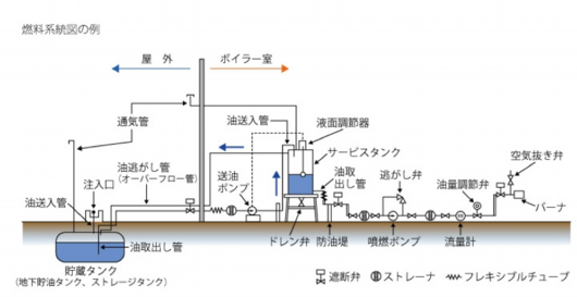 燃料油タンクには貯蔵タンクとサービスタンクがあります。貯蔵タンクは屋内、屋外の地下や地上に設置され、1週間〜1ヶ月の使用量を貯めておきます。サービスタンクはボイラーに燃料を供給するタンクで、通常は最大燃焼量の2時間分以上を貯めておきます。消防法により、燃料油はタンクや配管などは貯蔵タンク又は地下貯蔵タンクとその配管は構造上の技術基準が定められていますので、それを守らなければなりません。
