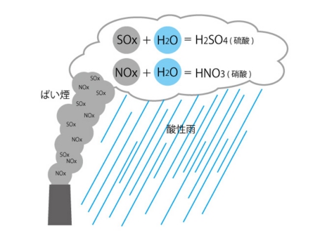 ボイラーの燃焼で排出されるばい煙は、主に硫黄の酸化物の二酸化硫黄(SO2)です。さらに数%の三酸化硫黄(SO3)、数種類の硫黄酸化物(SOx)が微量含まれています。硫黄酸化物は呼吸器系の障害、循環器にも有害な物質です。窒素酸化物とともに酸性雨(pH5.6以下の雨)の原因になります。