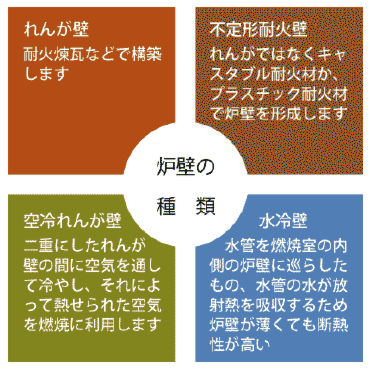 炉壁の種類には水冷壁、れんが壁、不定形耐火壁などがあります。水管ボイラー、炉筒煙管ボイラーの燃焼室のほとんどはボイラー水で冷却されており、れんが壁や不定形耐火壁は、バーナタイル部、燃焼室のコーナ部の一部に使用されています。