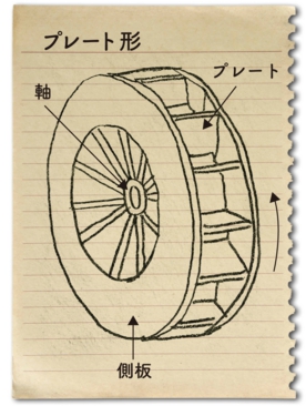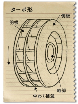 ファンは、通風方式に応じ、適切な風量、風圧のものを選ばなければなりません。ファンの素材は腐食、磨耗に強いものを選択します。ファンには多翼型、ターボ型、プレート型と主に3つの種類があります。それぞれの特徴は下記のようになります。